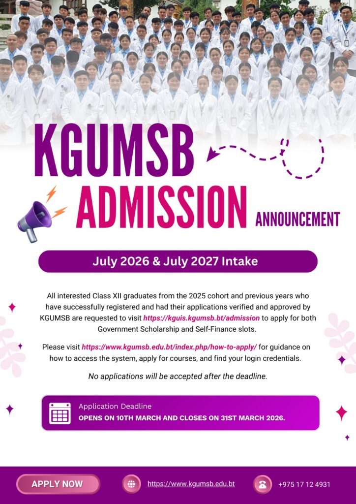 The Khesar Gyalpo University of Medical Sciences of Bhutan (KGUMSB) is pleased to announce the admission criteria and the vacancies in different programs under the KGUMSB, for the academic year July 2026 & July 2027 intake. As there will be no intake of class XII pass graduates in 2027 due to initiation of nine months Gyalsung Training, KGUMSB will select two batches of students for the academic year July 2026 and July 2027 to undergo Diploma and Degree courses in KGUMSB, from the graduates of class XII pass.